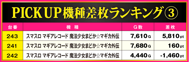 今回のPICK UP機種は全3機種。『L 東京喰種』からは+6,730pt、『パチスロ 革命機ヴァルヴレイヴ』と『スマスロ マギアレコード 魔法少女まどか☆マギカ外伝』からは+5,000pt超が発生。さらに、3機種トータルの全13台中9台がプラス差枚で実戦を終える見事な結果を残しファンを喜ばせていた。