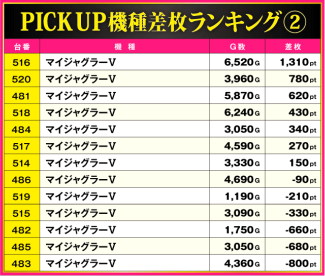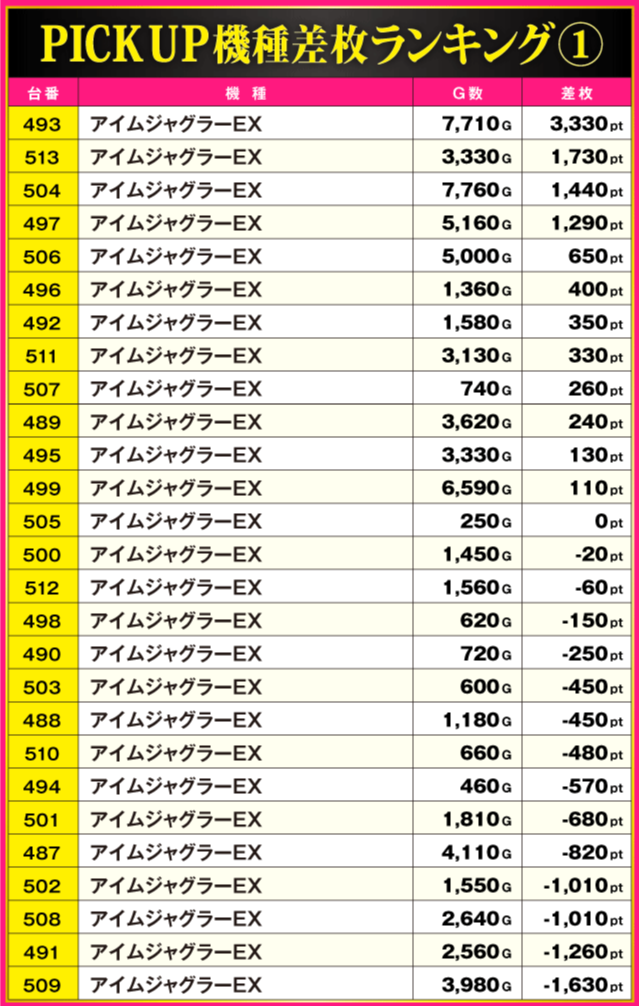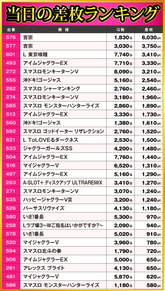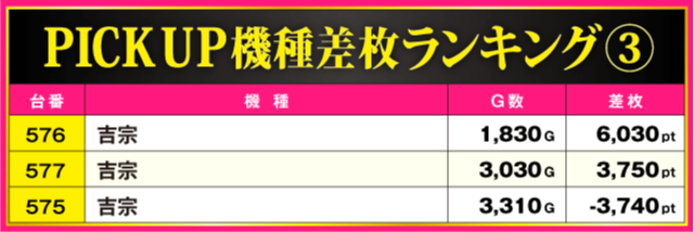 今回のPICK UP機種は全3機種。ランキングを制した『吉宗』は最終的に全3台中2台がプラス差枚で実戦を終えている。さらに、2つのジャグラーシリーズからも多数の好調台が確認されており、どちらも約半数の台がプラス差枚となる抜群の安定感を披露しファンを喜ばせていた。