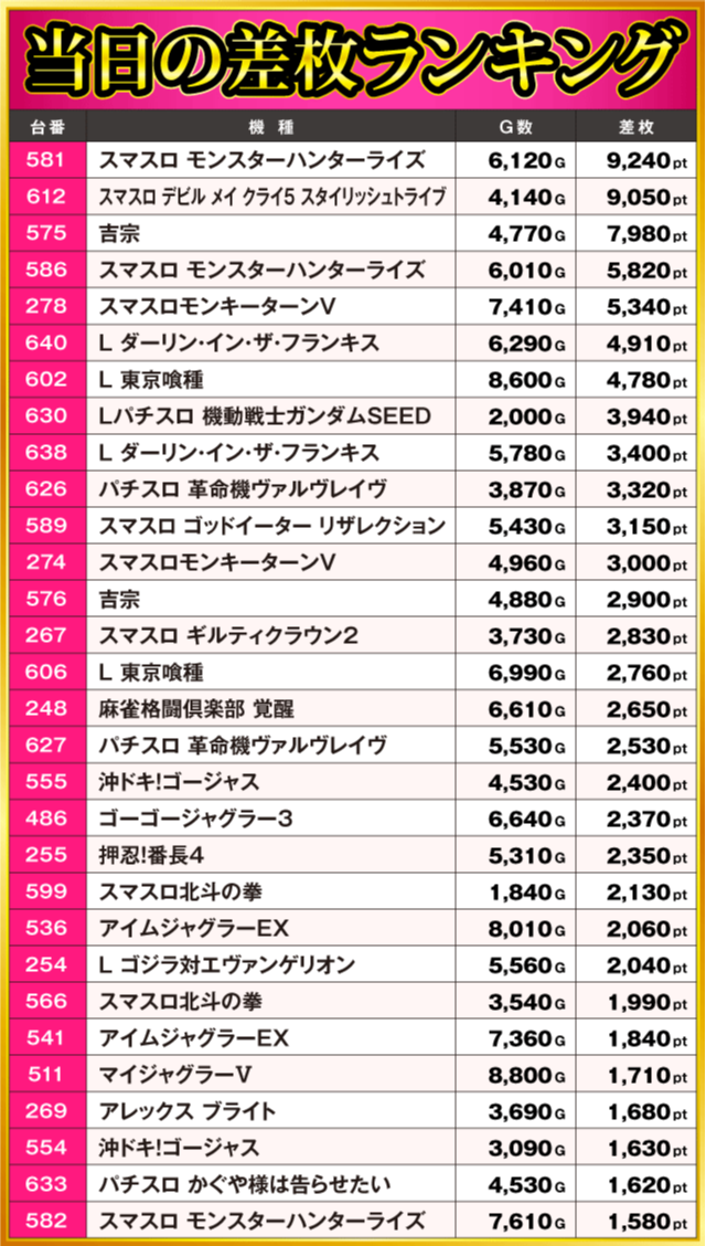 当日の差枚ランキング