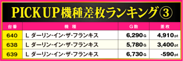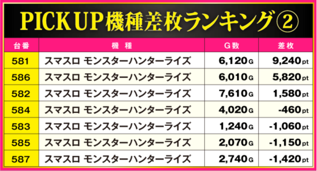続いてPICK UP機種の状況をチェック!! ハイスコアを記録した『スマスロ モンスターハンターライズ』からは、その他にも+5,820ptを確認。また、『アイムジャグラーEX』は約半数の台、『L ダーリン・イン・ザ・フランキス』は全3台中2台がプラス差枚となる見事な結果を残している。