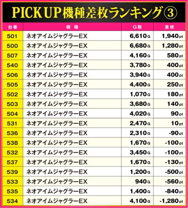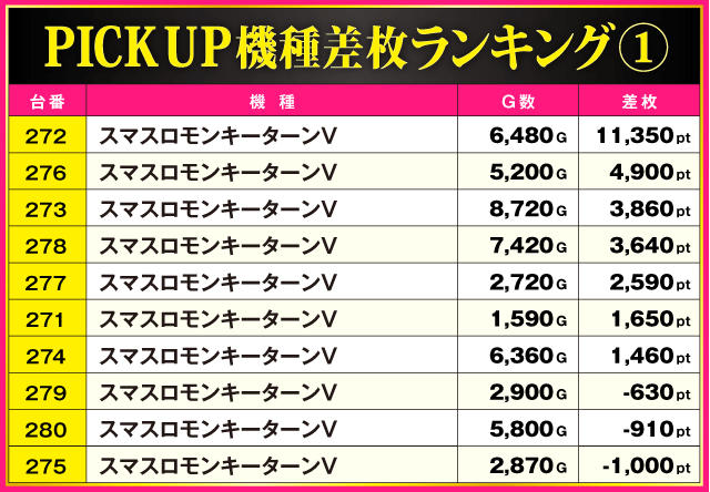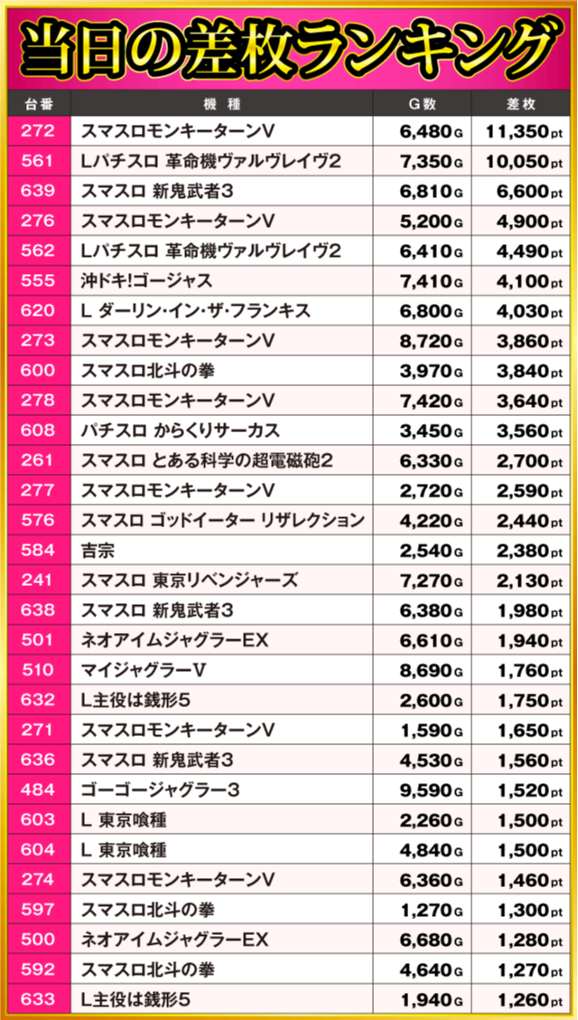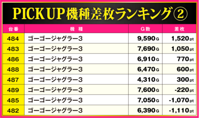 今回のPICK UP機種は全3機種。ランキングを制した『スマスロモンキーターンV』以外に、新旧2つのジャグラーシリーズからも多数の好調台を確認。両機種とも半数以上の台がプラス差枚で実戦を終える圧倒的な安定感を披露しているだけに、ファンにとって充実の一日となったのは間違いないだろう。