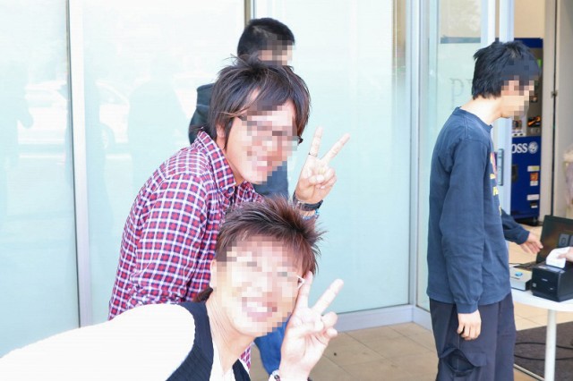 | 入場抽選時にカメラに向かってVサイン!!ノリのいいファンたち。抽選後も、各個集まり昔話に華を咲かせたり、昨日のホールの様子を伝え合ったりと楽しそう。 | |