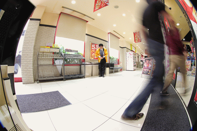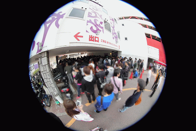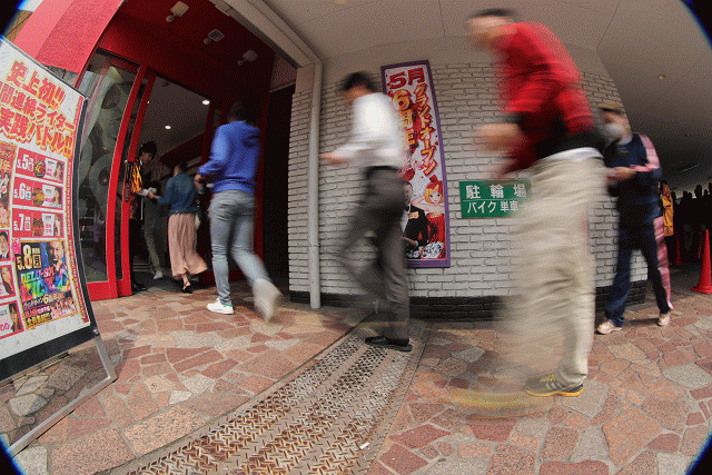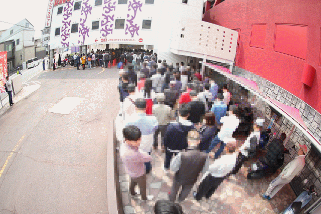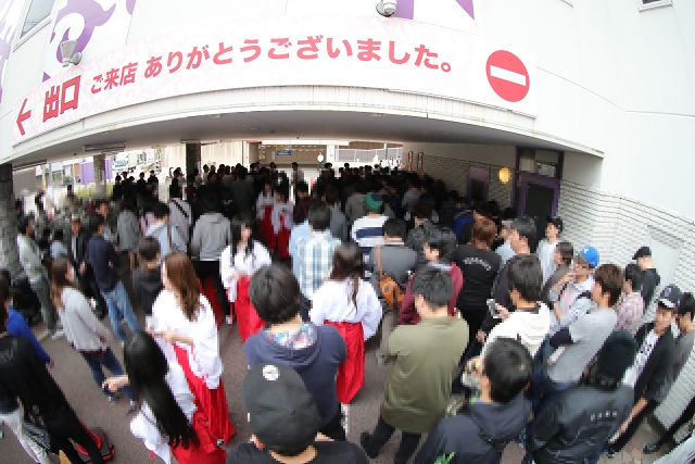 続々と入り口に吸い込まれるファンの嬉々とした表情が羨ましい!この日も店長を筆頭に、スタッフが(祝)の文字入りゴールデンハッピを着て丁寧にお出迎え。