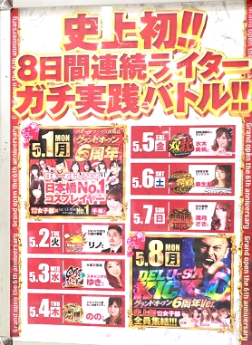 6周年を迎えた『デルーサマックス市岡店』は、この日から色々な催しファンサービスや、スペシャルなゲストも選り取り見取りで来店するようだ。