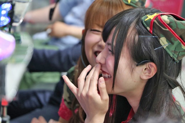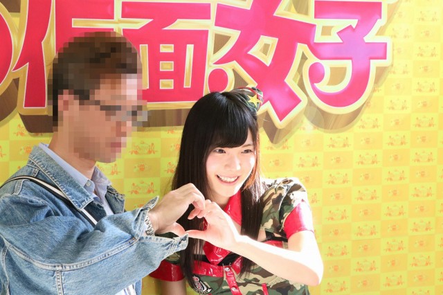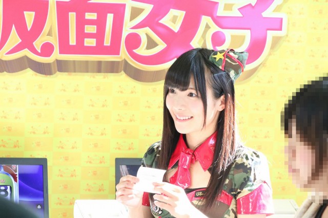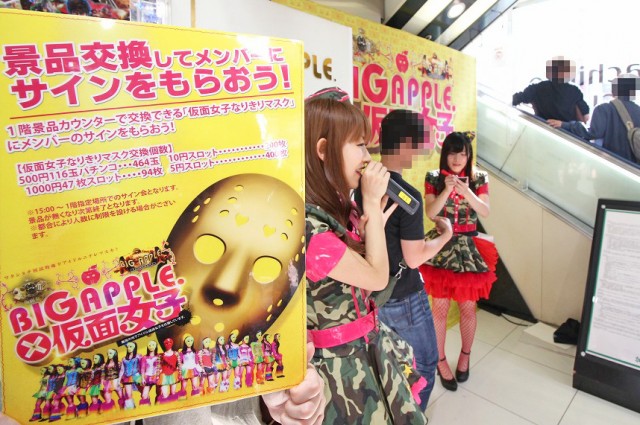 | 昨年末より最強の地下アイドルと名高いユニット「仮面女子」とコラボしている同店。その店内アナウンスが4月26日より一新され、より密度の高いコラボが果たされた。 |