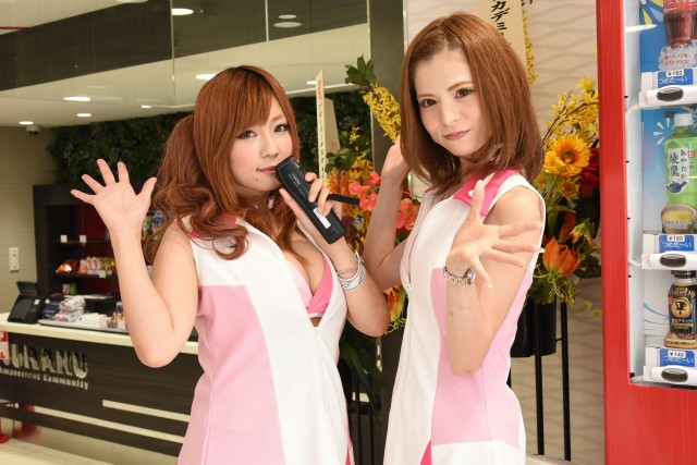 セクシーな衣装で応援するコンパニオンによって、ファンからも笑顔がこぼれる。