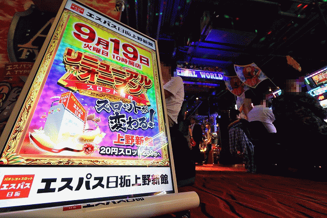 | エスパス上野の3店舗で唯一の専門店「スロット専門館」。1階・2階の新台・人気機種フロアはもちろん、3階の沖スロフロア、地下1階の『ジャグラー』フロアも好稼働中!! | |