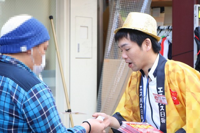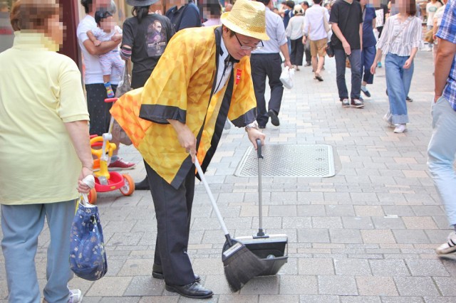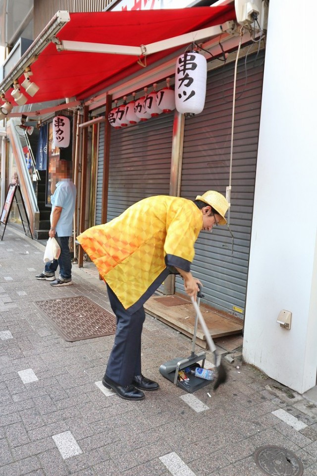 その手にはホウキとチリトリ。前回と同様、変わらぬ地域愛で店舗周辺を清掃していた!!