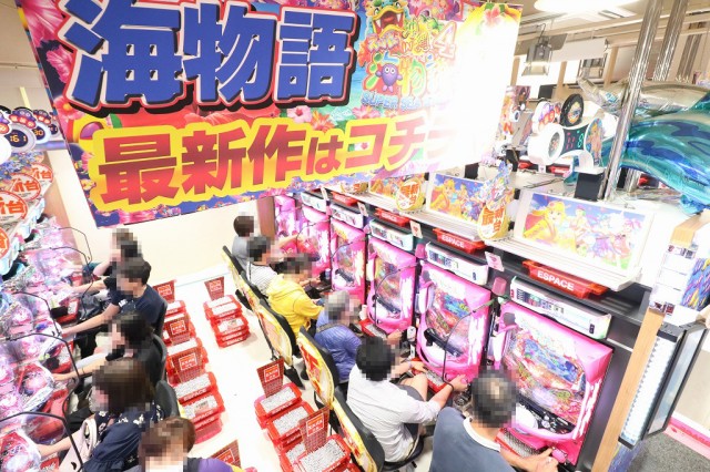 | 入ってすぐ。『海』シリーズの稼働は圧巻の一言。地下の話題機種がズラリ揃ったパチンコフロアも、2、3階のパチスロフロアも各階共に活気がブレイク中! | |