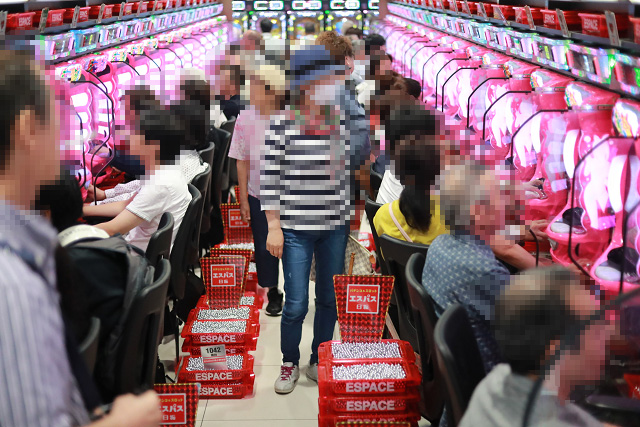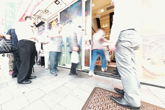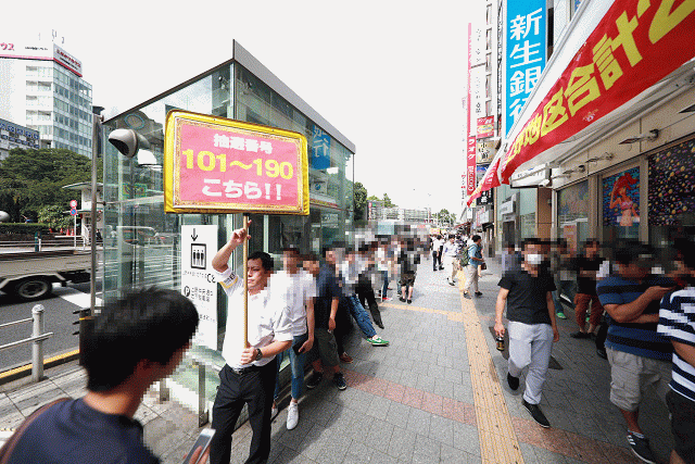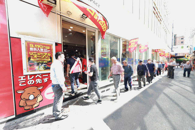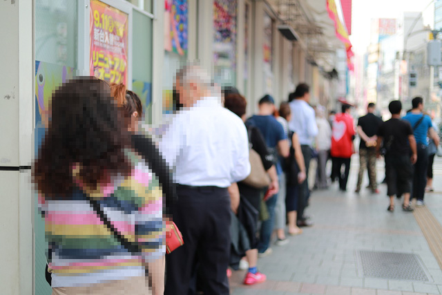 パチンコフロアオープンの為に、大勢の常連ファンが並びはじめる。