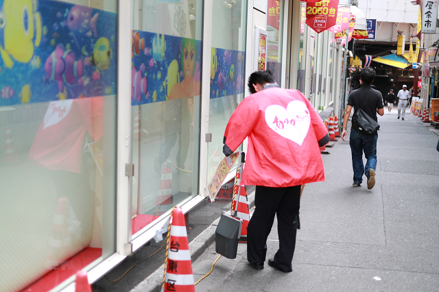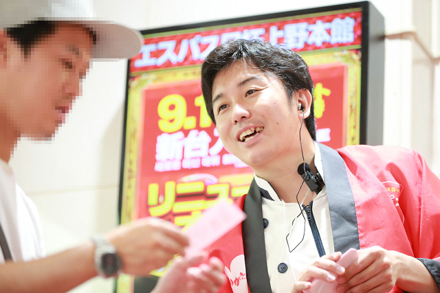 開店前に店舗周りの清掃をするスタッフ/ファンと元気に交流する姿も