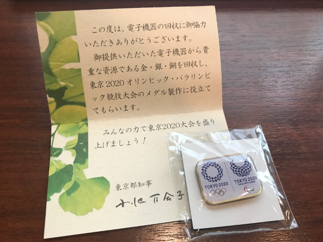 最後にお礼として、都知事の名前入り感謝状とピンバッジをもらえました。