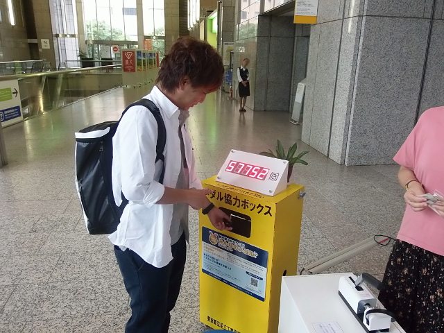 場違い感丸出しでドゲさんのあとをついていった先には「都市鉱山からつくる!みんなのメダルプロジェクト」なるブースが。聞けば、不要になった携帯電話などの小型電子機器を回収して、東京オリンピック&パラリンピックで使われるメダルへと生まれ変わらせるのだとか。
