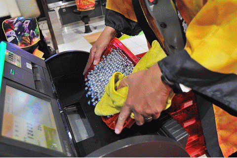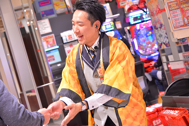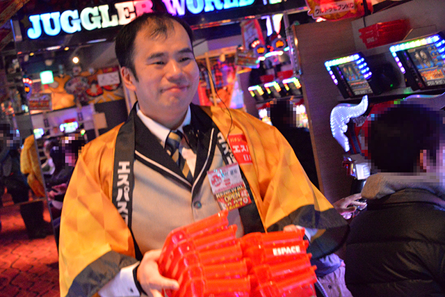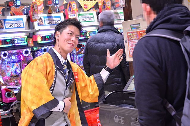 大当りを迎え、玉下ろしをしたファンにただいま5箱ですと伝えるスタッフ。さりげない一言がサービスの本質を表している。