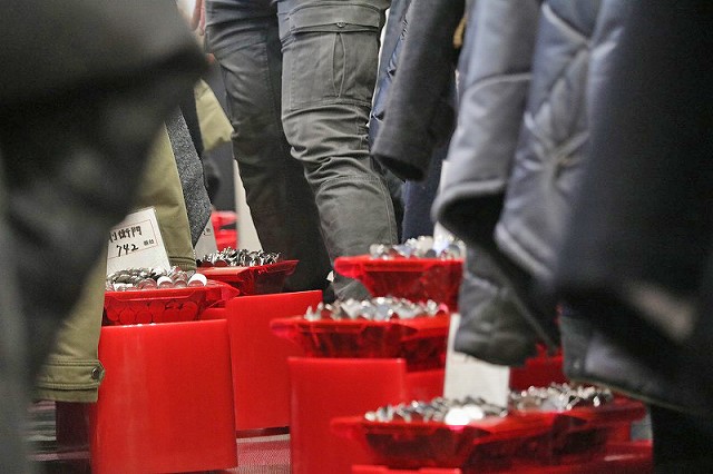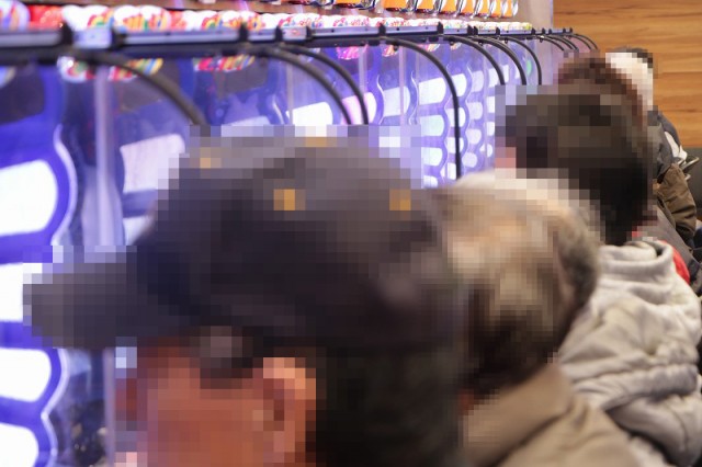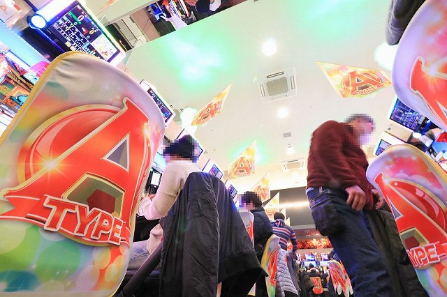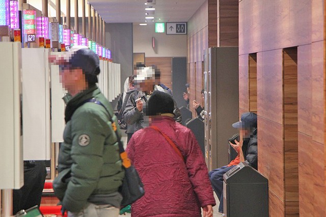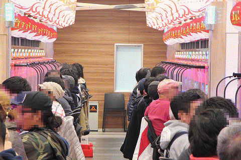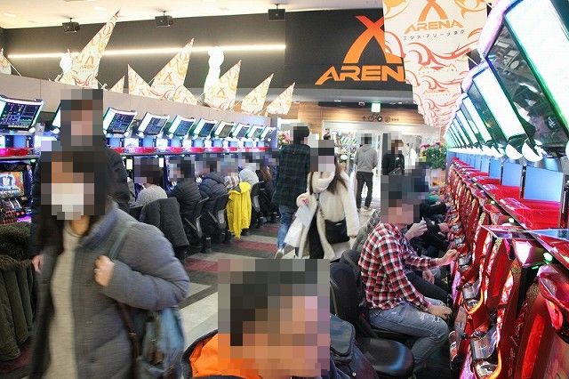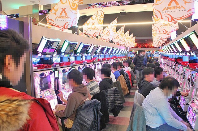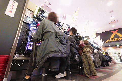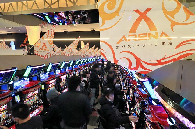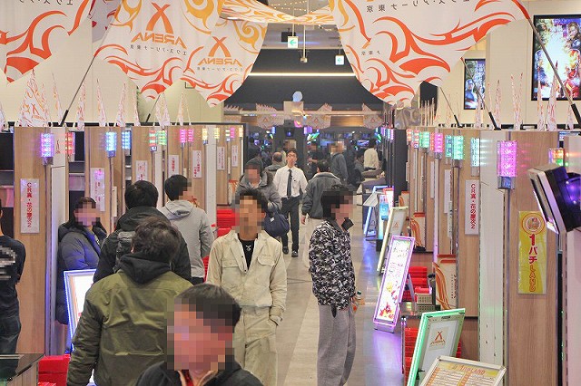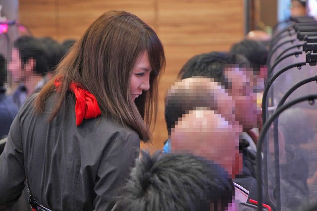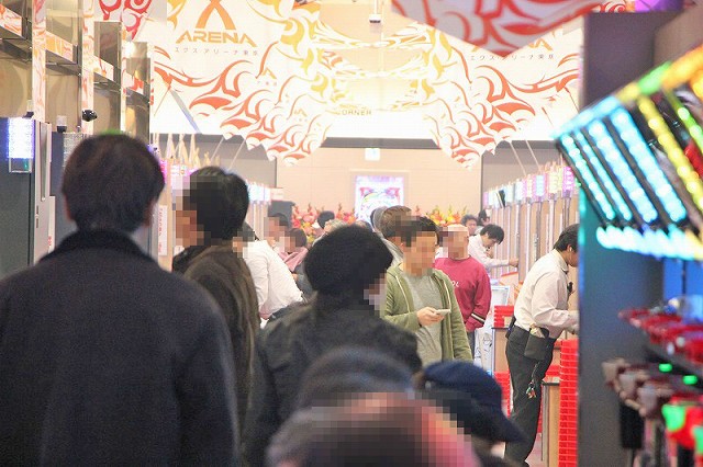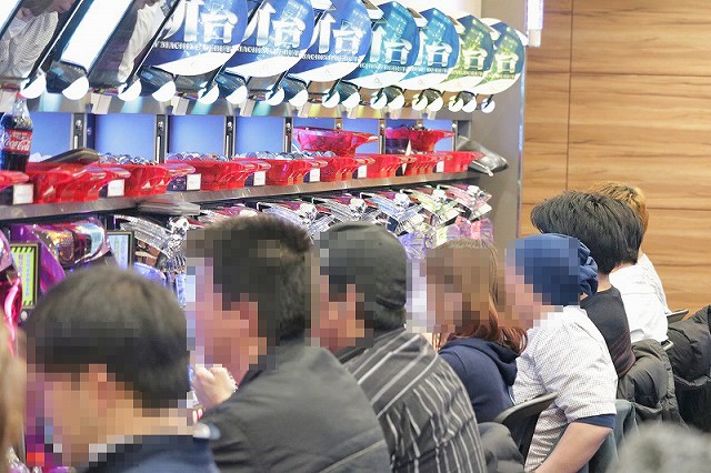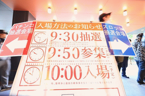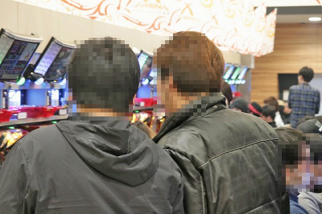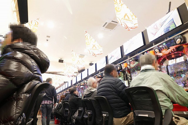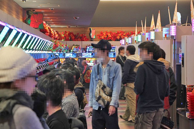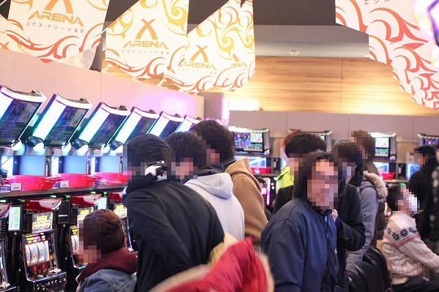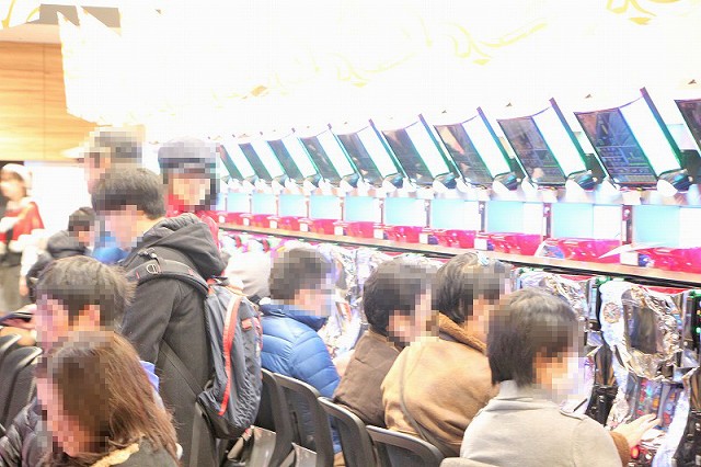 それでもあきらめ切れないファンは、立ち見状態で虎視眈々と狙い台GETのチャンスを待つ!