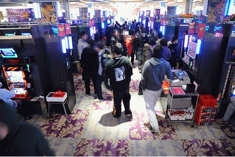 朝から満台だったアニメパチンコフロアもこの通り。通路を見れば、アニメキャラクターたちがいかに暴れ回ってくれたか、一目瞭然!