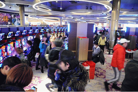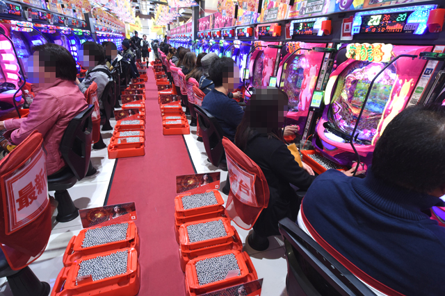 通路に広がるボリューム感たっぷりの光景が、嫌が応にも期待感を倍増させてくれる。シマ内の8割以上が持ち玉を有しているという異常事態に、空き台を探し求めるパチンコファンが跡を絶たなかった。