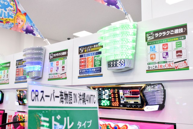 そう、「パーラージュピター厚原店」は静岡県で初めてパチンコ・パチスロ全台に各台計数機を導入したのだ。玉・メダルの交換がスムーズに行えるうえ、台移動もラクラクっ!!色んな機種を気軽に楽しむことができるのは魅力的!!うん、快適過ぎっ!!