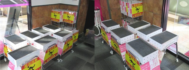 賑わうシマ横には、足元注意を促す台座も準備万端!!