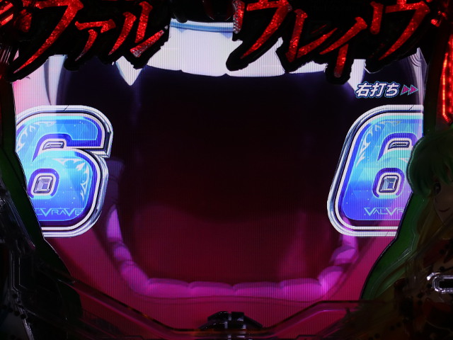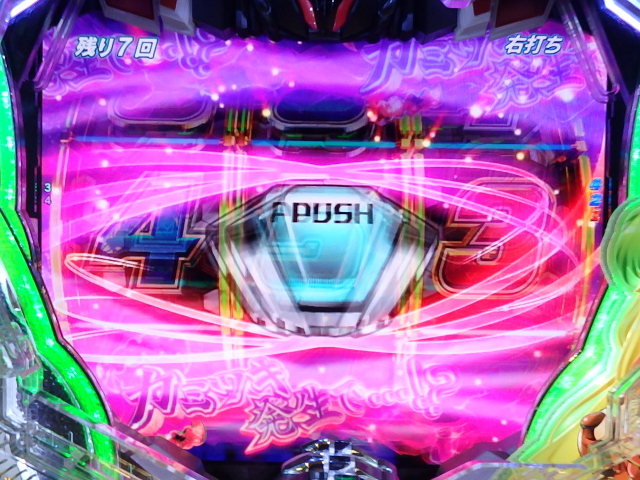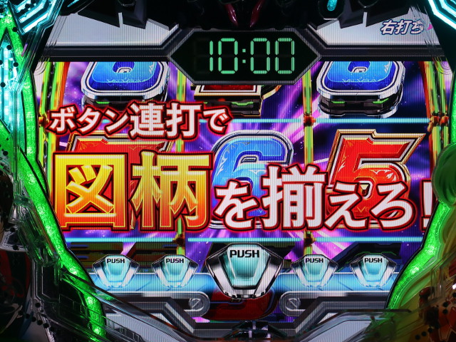 詳細に説明しますと、大当り消化中にVコンを引くと、落下している右ロゴ背後の液晶にボタンアイコンが出現。ボタンを1回押すたびに「×7、×6、×5…」と表示された数字が減っていきます。