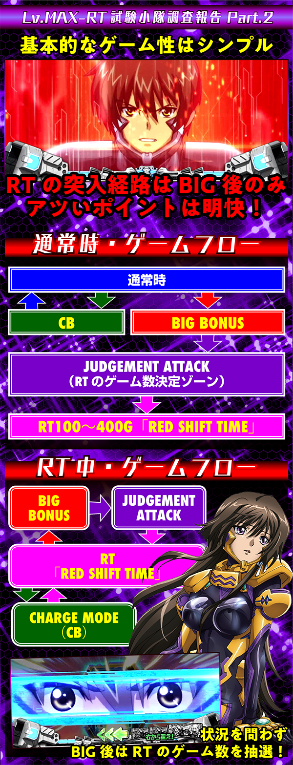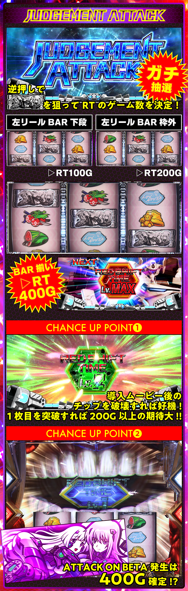 通常時とRT中共通で、BIG消化後はRTのゲーム数を決定するJUDGEMENT ATTACKに突入。ガチ抽選でRT100or200or400Gを決めるだけに、アツくレバーを叩けるポイントだ。
