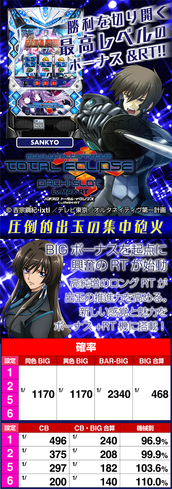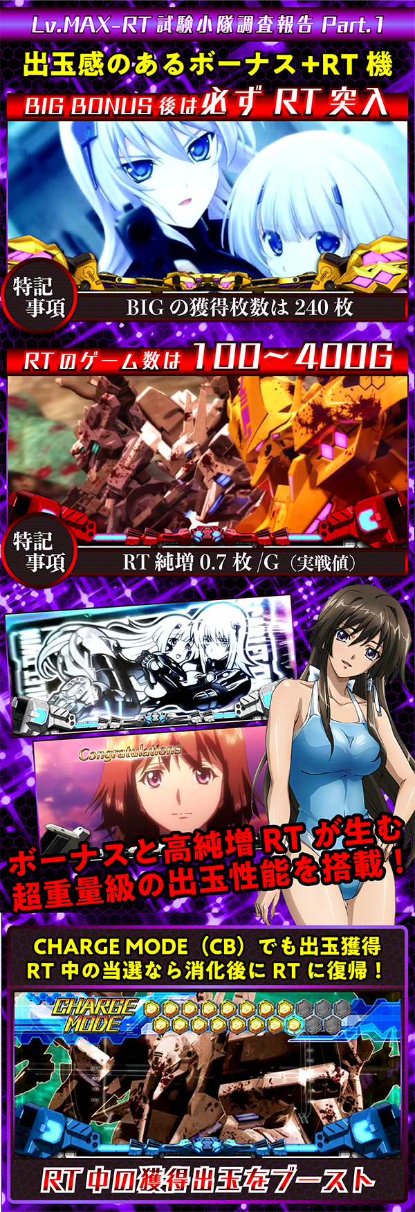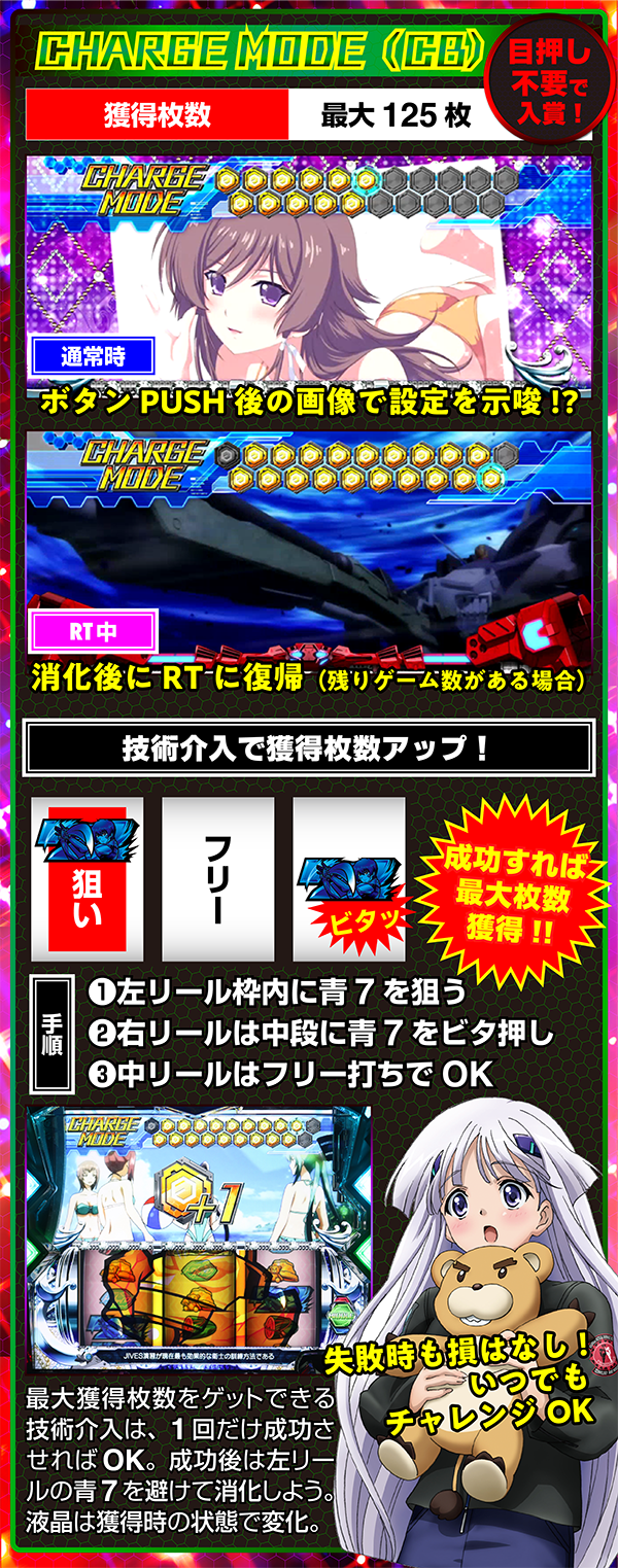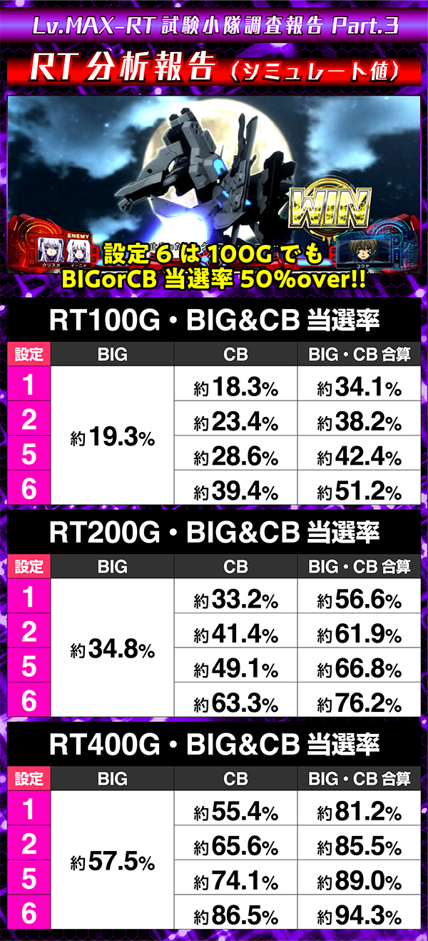 CB確率に設定差があり、純粋に高設定ほど1回のRTで大量の出玉を獲得しやすい。RT400Gの場合は設定1でもBIGorCBの当選率が8割超と、破壊力が抜群!