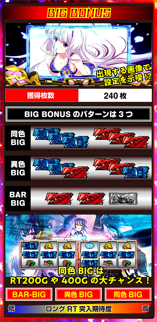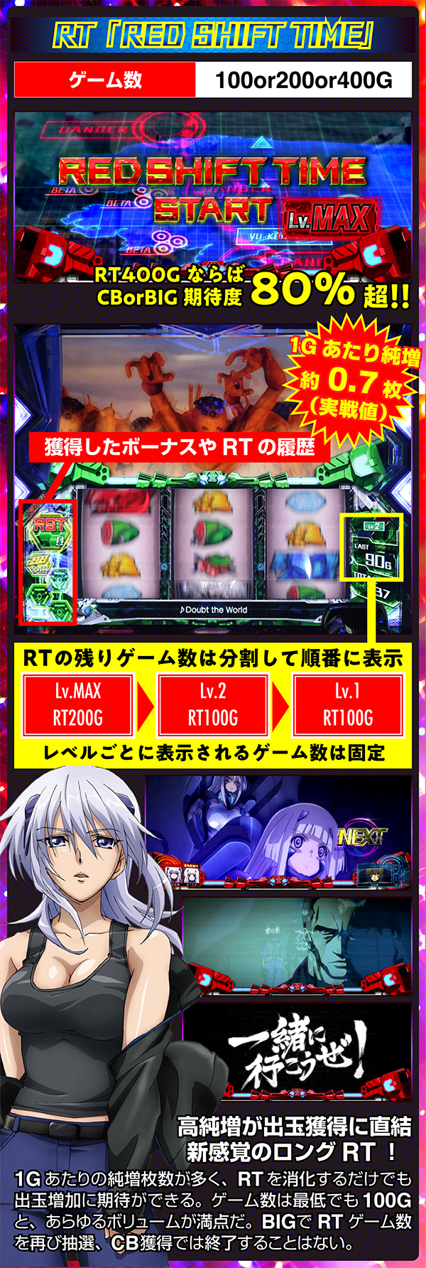 BIG終了後に必ず突入するRTは最低でも100G、最大は400G。ゲーム数が多いことにくわえて、高純増とRTだけでも出玉増加に期待ができる。