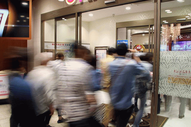 いよいよ、その瞬間が訪れようとしている・・・。店舗に設けられた幾つもの出入り口に、ファンが再整列。どの入口も黒山の人だかりだ!ワクワク、ドキドキが加速する。そして・・・