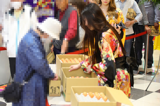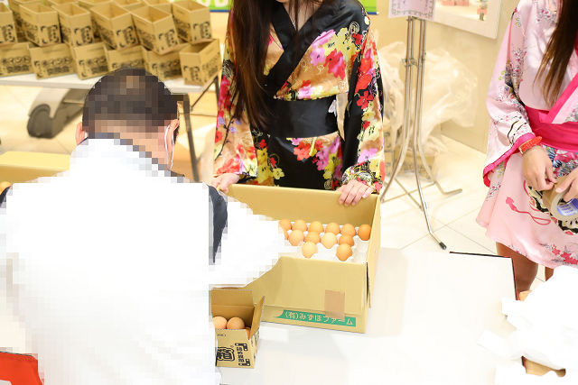 14時の「京の赤たまご」詰め放題。配布された箱に、丁寧に詰め込むファン。たまごを割らずにどれだけ多く入れられるか、技術介入が必要な催しだ