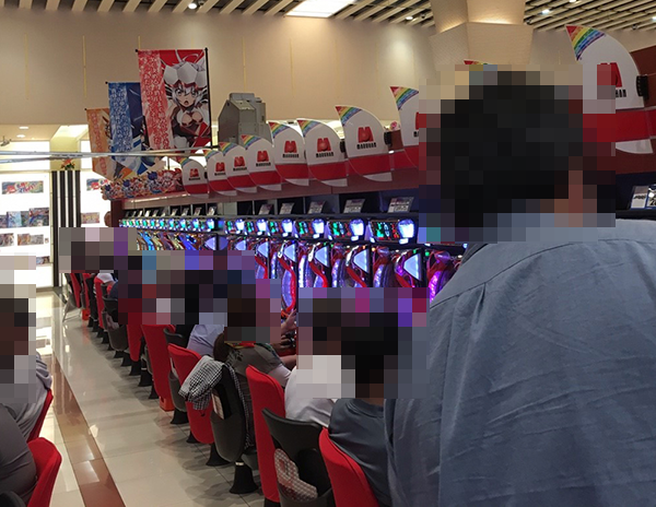 シマ内を見渡してみると、右にも左にも、楽しそうに遊技をおこなっているプレイヤー。台を見ると、めまぐるしく変化していく7セグ。図柄が3つ揃う瞬間をまるで自分のことのように堪能しつつ、調査を続行した。