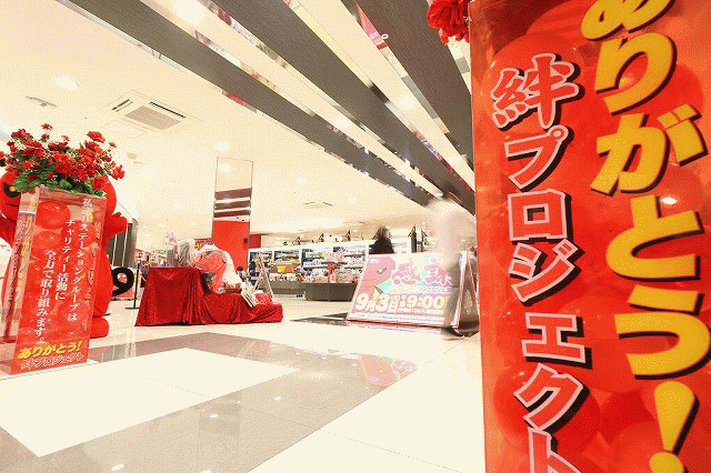 | 色とりどりの賞品群。その中にはズナーキーのグッズ。そして、同じくイメージマスコット「きずなちゃん」のグッズもラインアップに仲間入り。 | |
