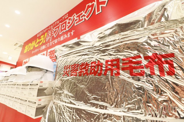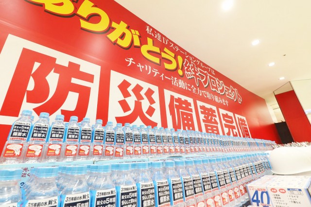 | グループで推進する「ありがとう!絆プロジェクト」。その一貫でもある防災備蓄が、神奈川5店舗それぞれのカウンター前にズラリ完備されている。 | |