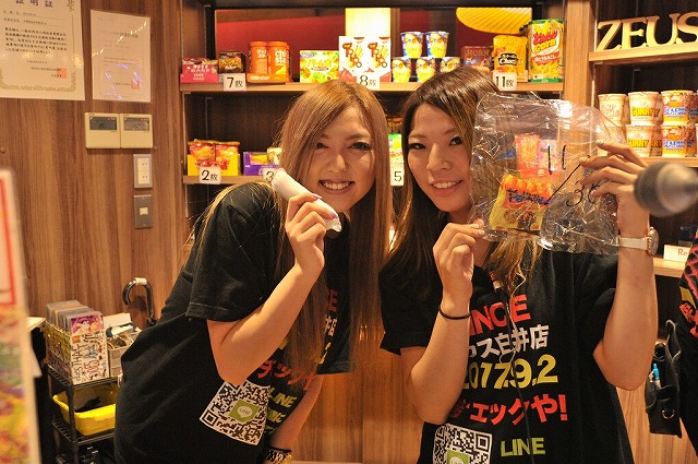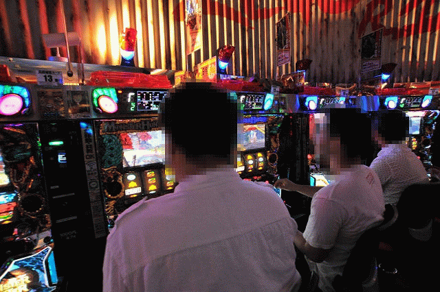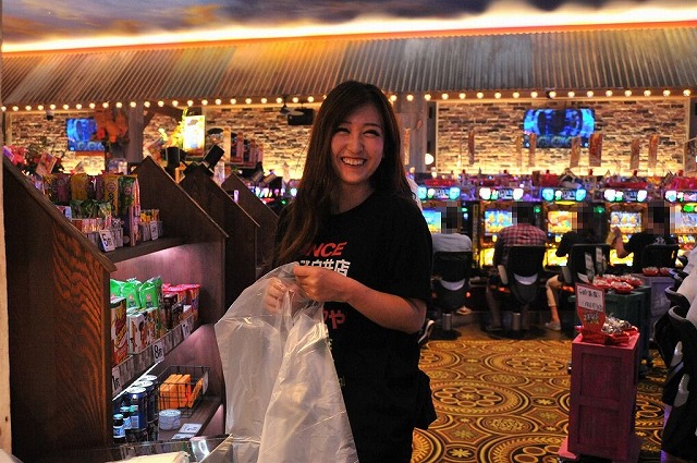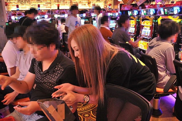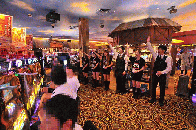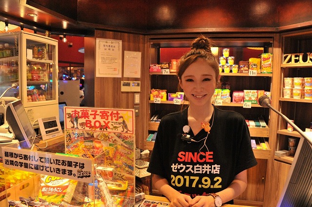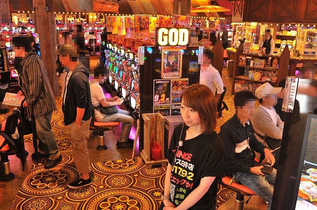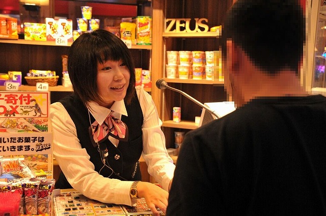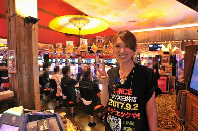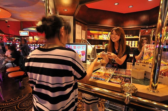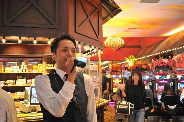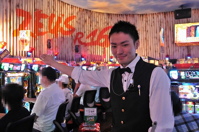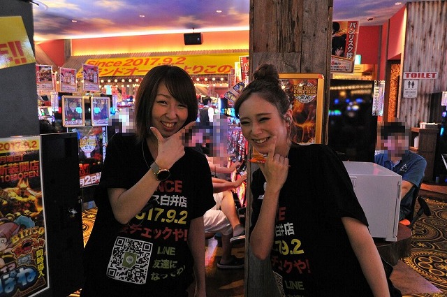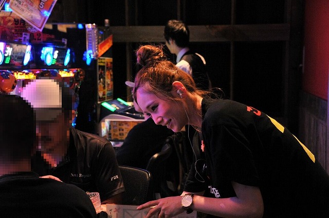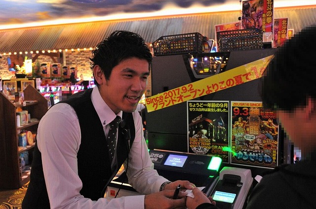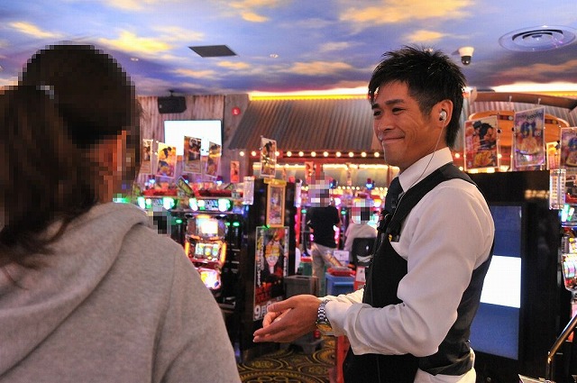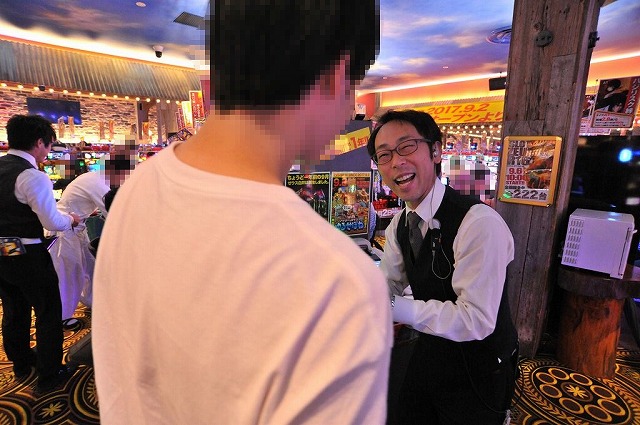 | スタッフの笑顔も、ファンとの絆の輪を紡ぐ、同店最大の魅力のひとつ。遊技中、スタッフたちと楽しく会話しているファンの姿が、数多く見受けられた!! |