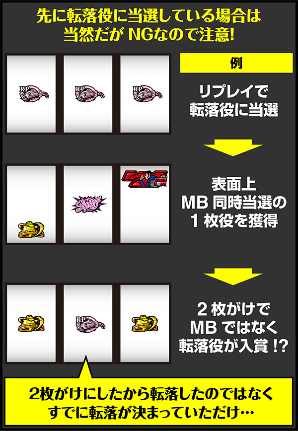 2枚がけ時は高確率で転落役が成立するが、ボーナスやMB内部中は抽選されないため、転落役に当選する心配はない。