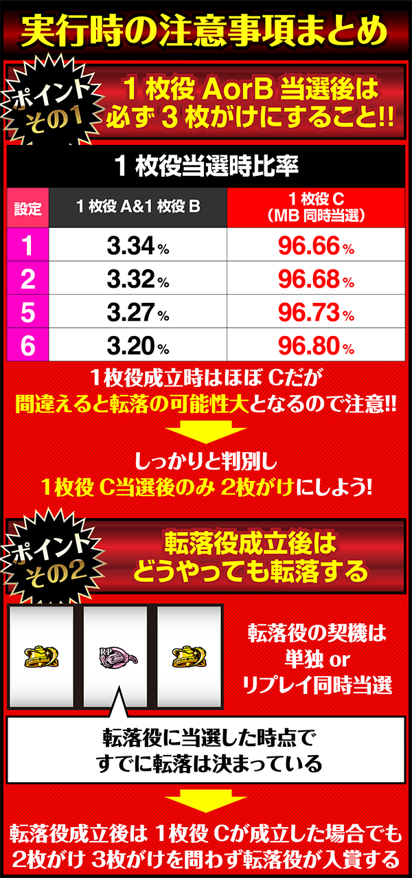 転落後も1枚役自体の確率は変わらないため、上記のようなケースでは2枚がけにしたことで転落した(転落役をひいた)と勘違いするかもしれないが、実際はすでに内部的には転落役に当選していただけ…。