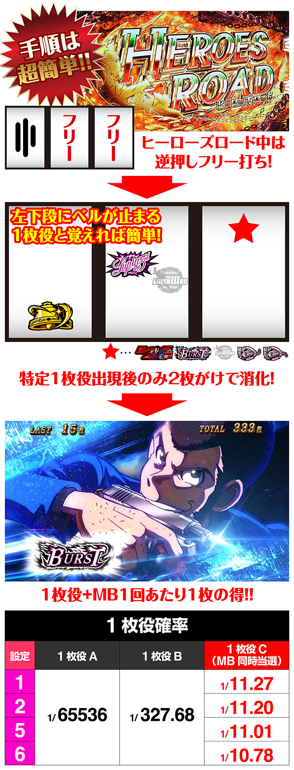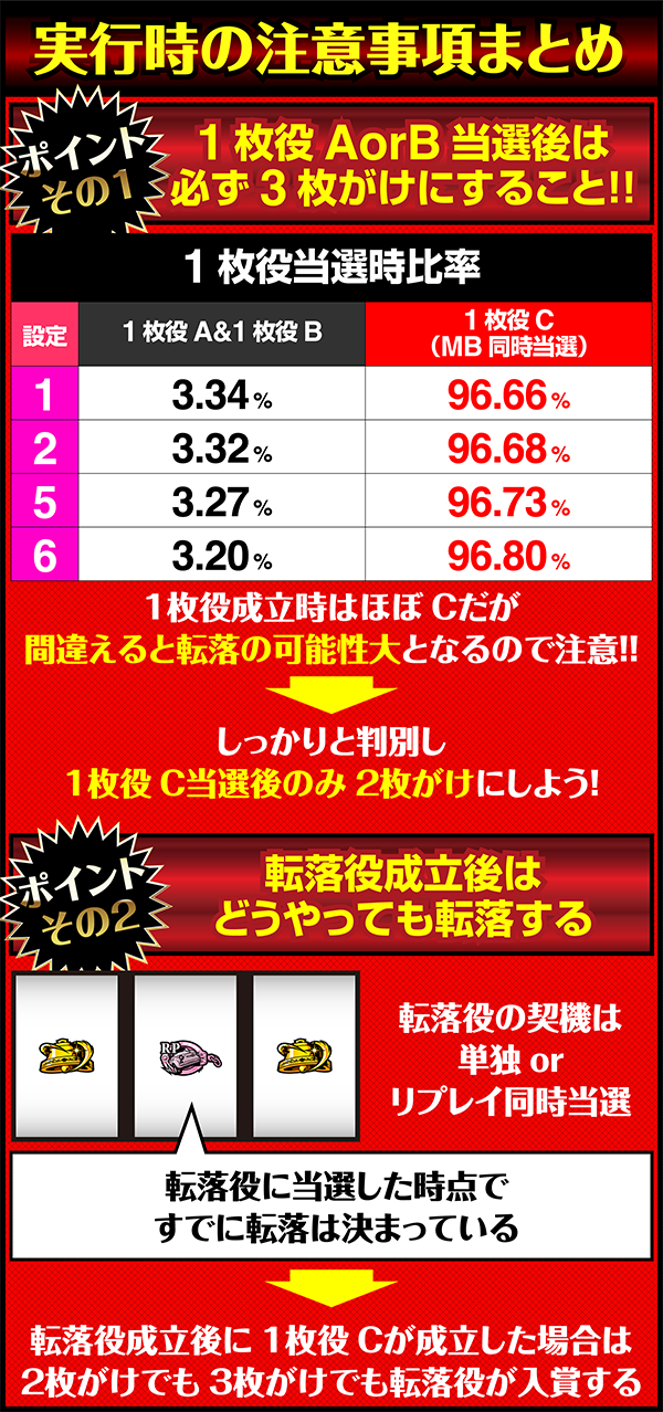 ただし、1枚役AとBはMBと同時当選していないので、2枚がけをすると高確率でHRが終了してしまうので要注意です。