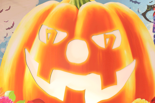 | 間も無く訪れるハロウィン仕様に飾られた入り口。アニメ『魔法少女まどか☆マギカ』のED曲「Magia」をはじめ、様々な機種のテーマソングが流れている。 |