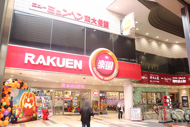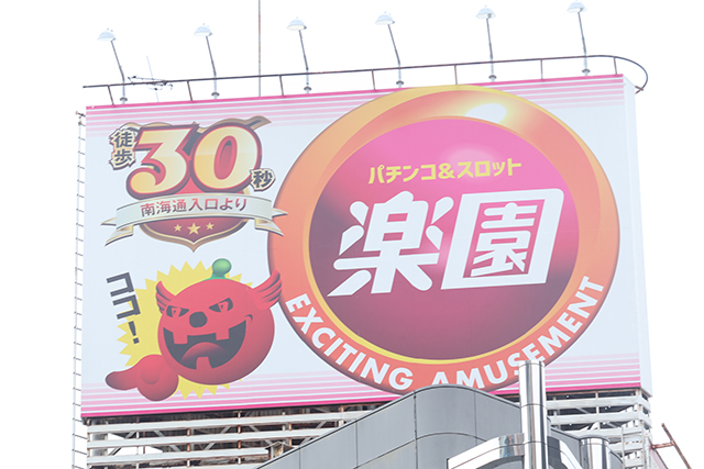 | 「なんばCITY」から徒歩約5分。「なんば南海通」から見える、「楽園なんば店」の大きな看板が目印だ! | |