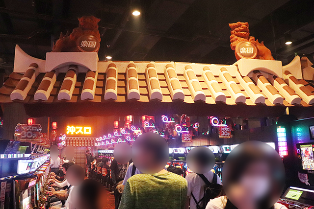 | みんな大好き『ジャグラー』コーナー。「楽園なんば店」仕様のこだわり空間で、ジャグ好きのファンの憩いの場となっている! | |
