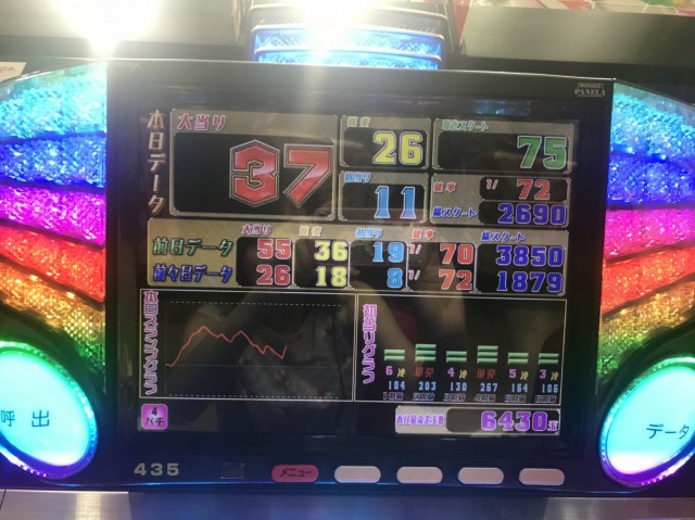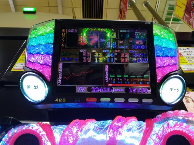 自分の台は前日の差玉がかなりマイナスだったので、実は設定上げ狙いだったんですよね。しかし、最初の連チャン中に3桁ハマリが発生。たった1回で判断するべきか迷いますが、高設定ではなさそう。