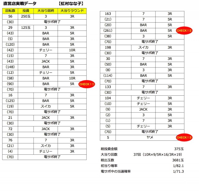 結果としてプラス収支で終えたものの、当選確率などから推測すると中間設定の3ぐらいと考えられます。虹村は「設定6です!」と言い張ってましたが……。