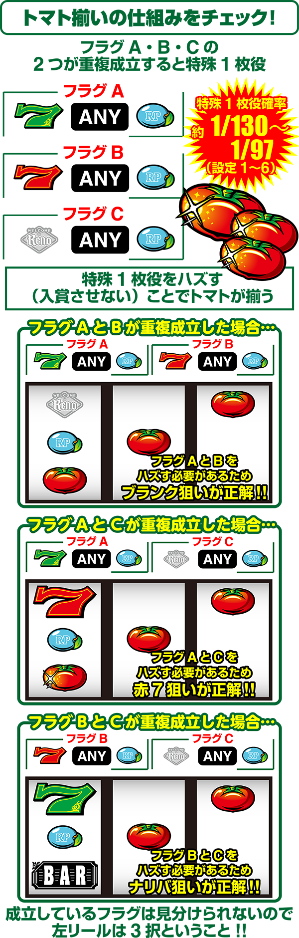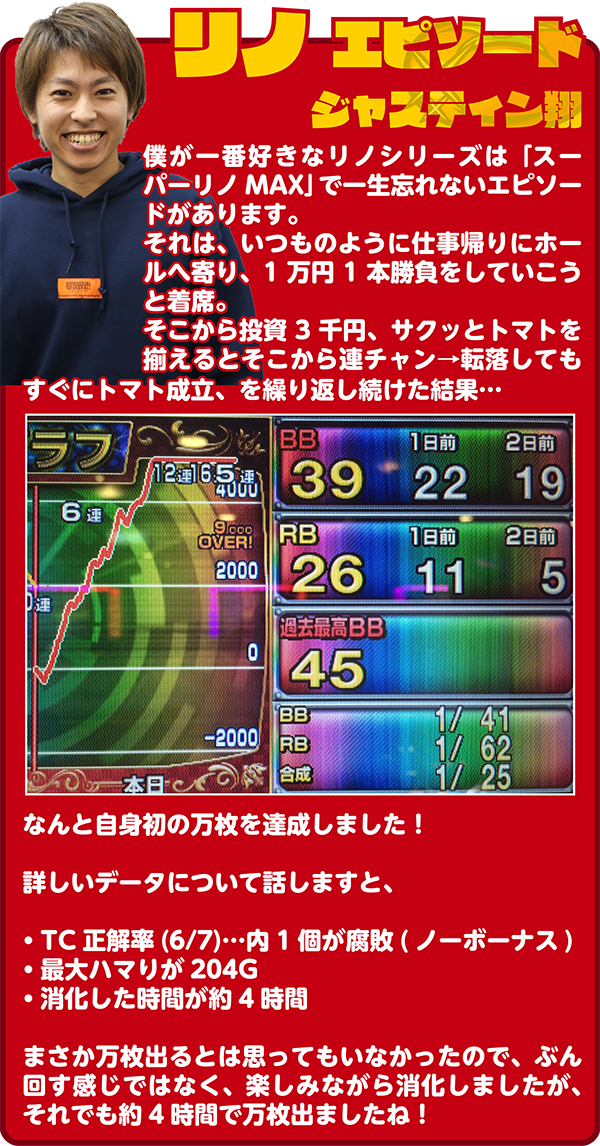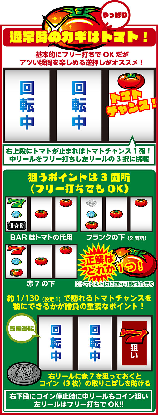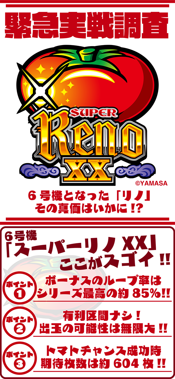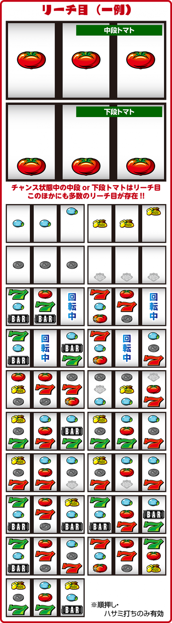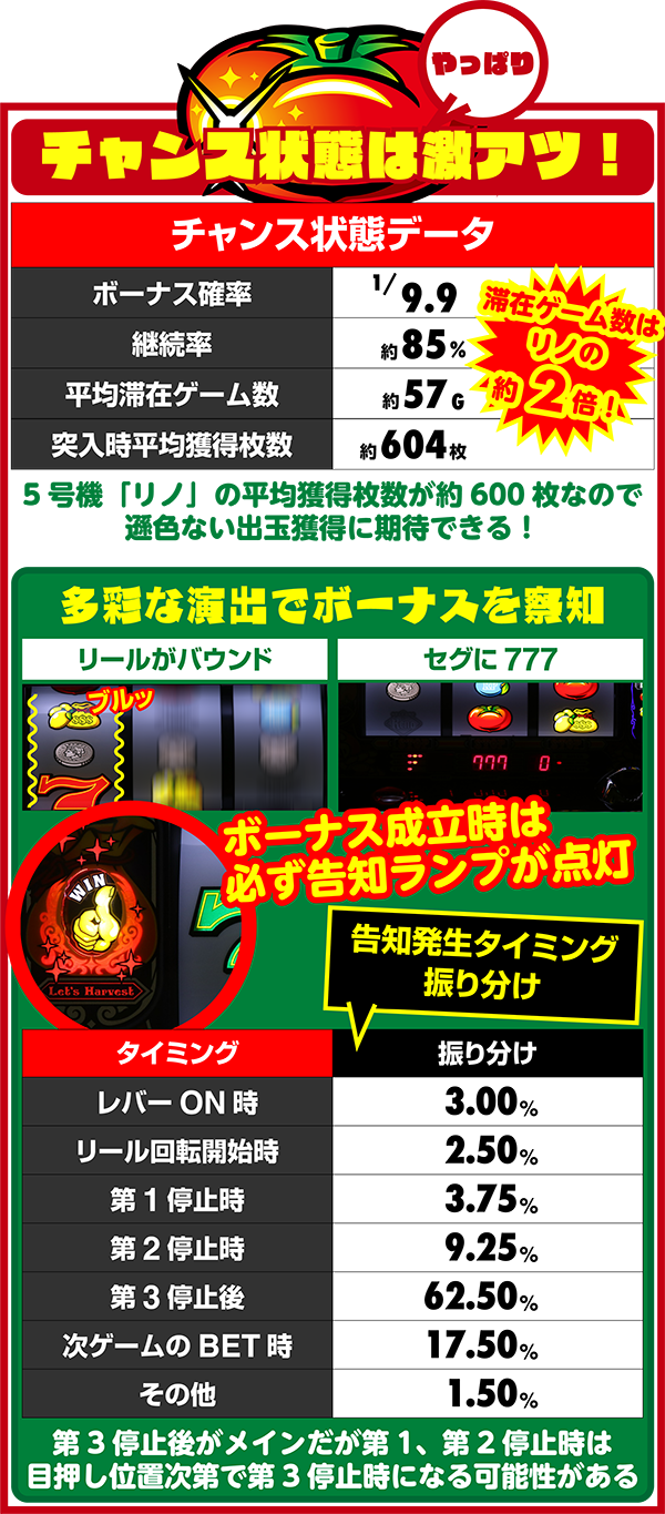 トマトが揃えばボーナスのチャンスというおなじみの仕様はそのままに、チャンス状態突入時の平均獲得枚数は604枚と、5号機の『リノ』にもまったく引けをとらない。