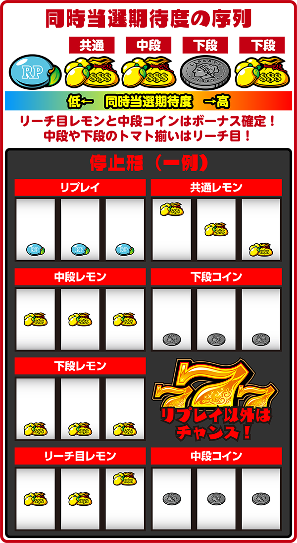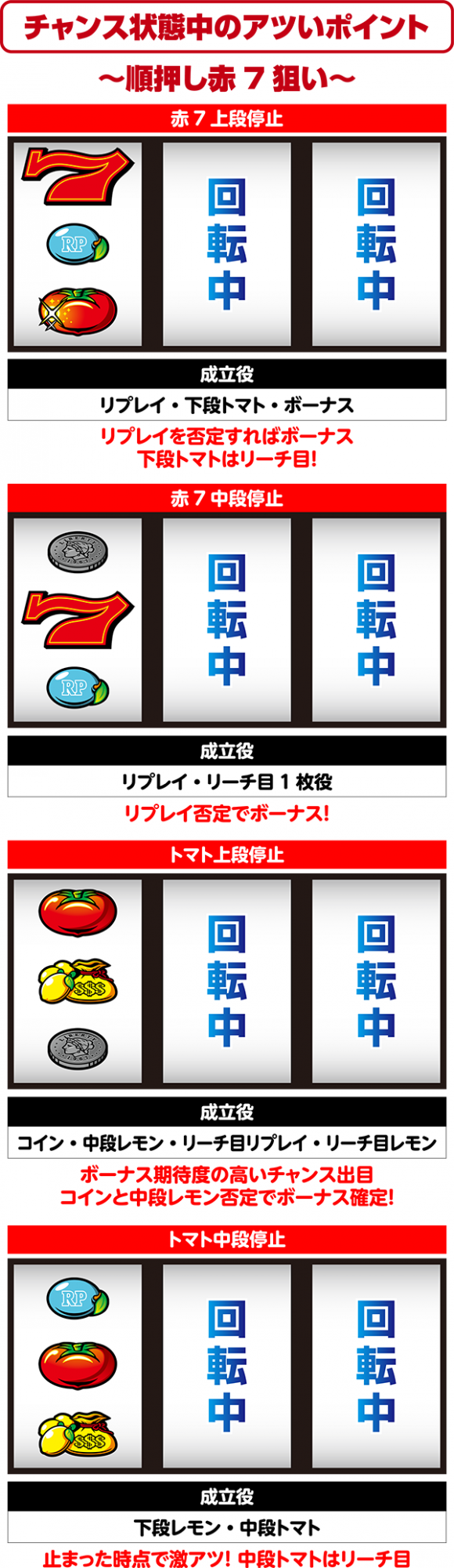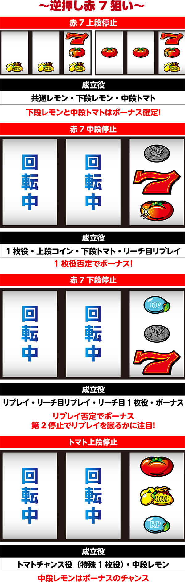 順押しで中段にリプレイ・リプレイ・レモンが止まるとハズシ成功。次ゲームからはボーナス終了まで逆押しフリー打ちで消化しよう。