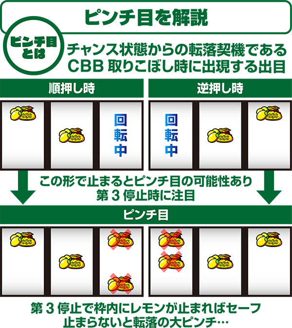 では、ピンチ目が出たらヤメても良いのかといえばそういうわけではない。チャンス状態中の純ハズレがピンチ目と同じ停止形をとるため、転落したか否かをそのゲームで判別することができないのだ。