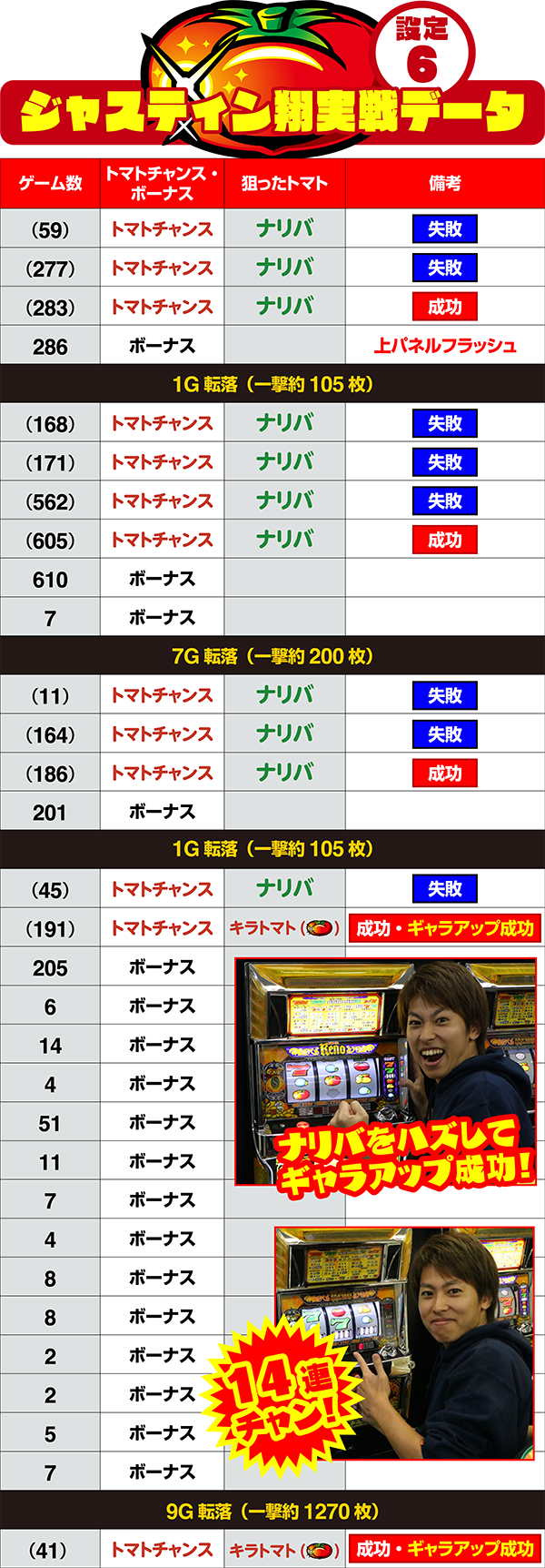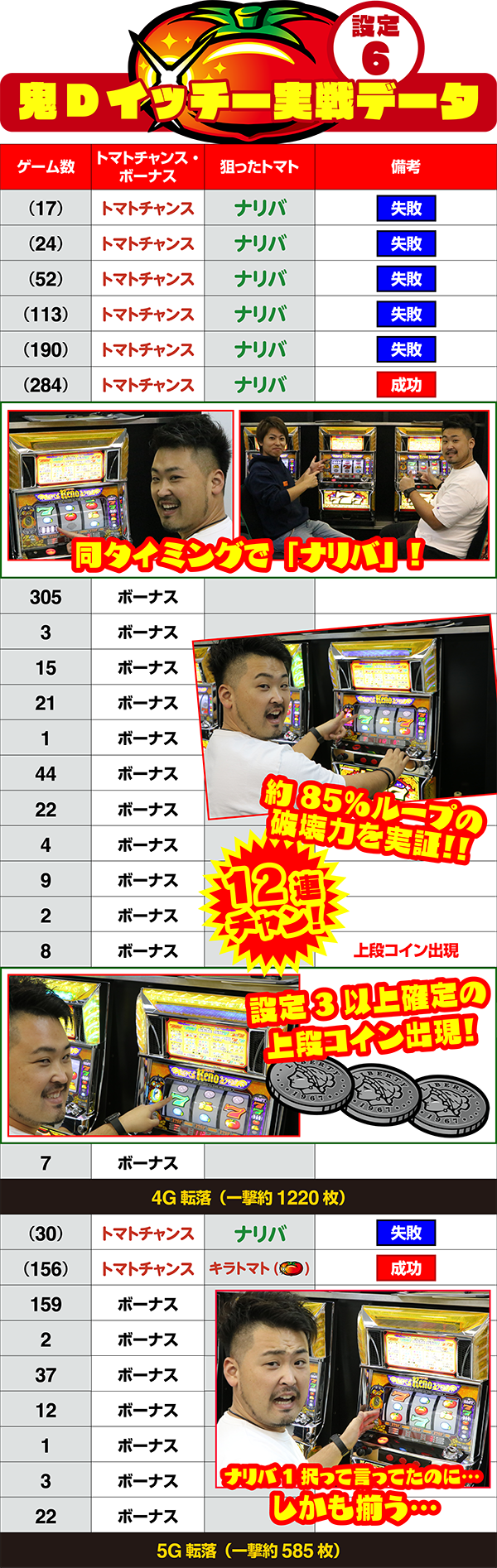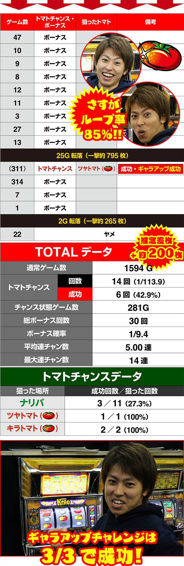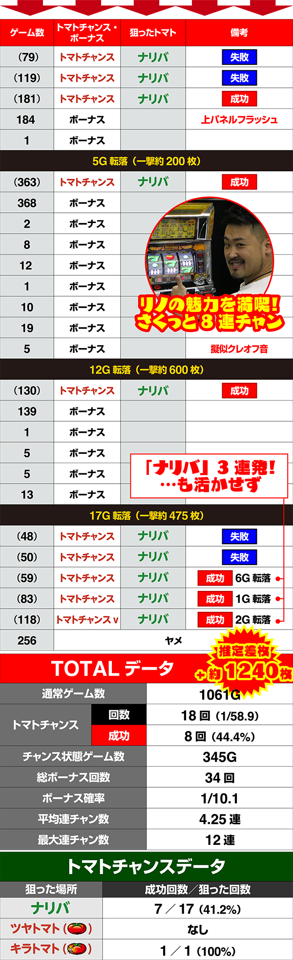 終わってみれば総トマトチャンス確率1/58.9、左リールの3択正解率44.4%と、圧倒的なヒキで快勝。ナリバ論を実証する形となった。