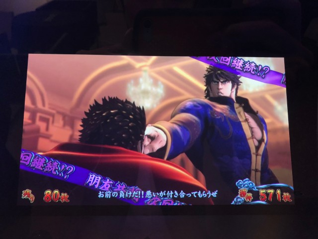 バトル勝利で再び死合の刻へ突入し、このふたつをループさせることで出玉を獲得するシステムとなっており、その継続率は約66%~89%と、こちらも初代北斗の拳を完全継承している。