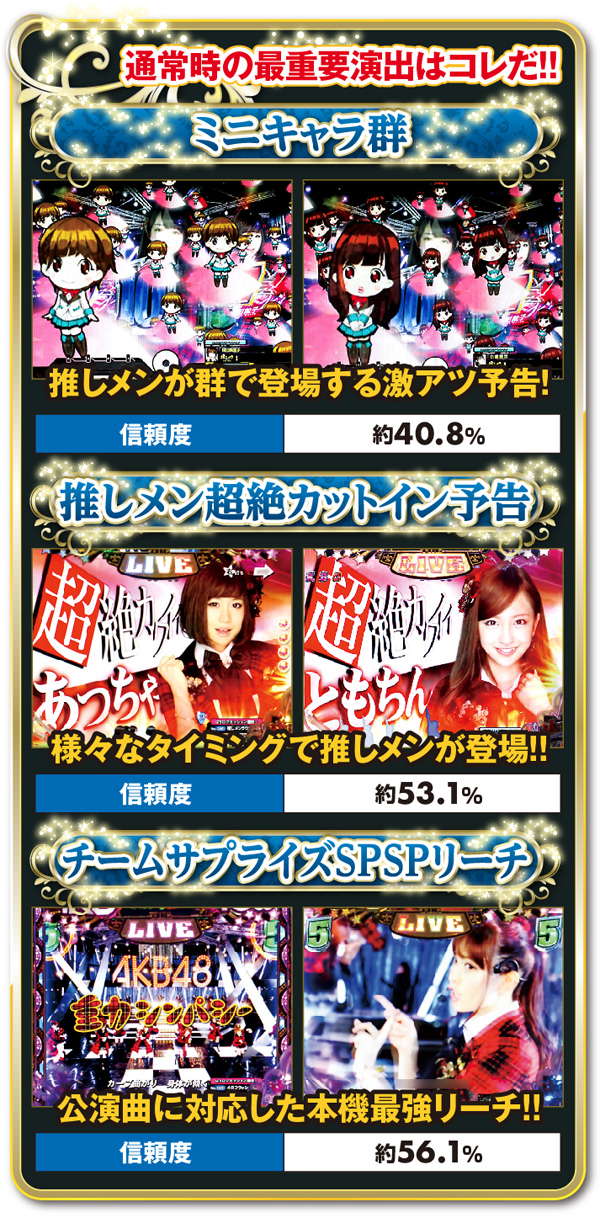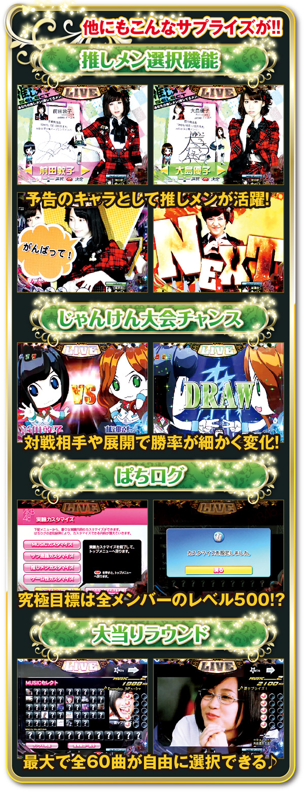 ちなみにRTC機能により、公演曲は1週間毎に変化。また一部の予告やリーチ演出も公演曲に応じて変化するという凝りようだ。