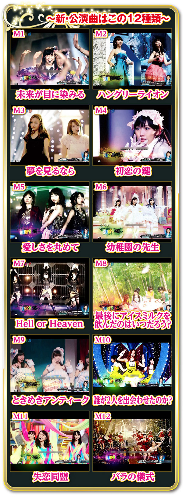公演タイトル曲の「重力シンパシー」を始め、5人組の衣装がキュートな「水曜日のアリス」、板野友美がスローテンポな曲を熱唱する「そのままで」、金色のセクシー衣装が目に眩しい「涙に沈む太陽」などなど、全ての曲とムービーがサプライズだった。