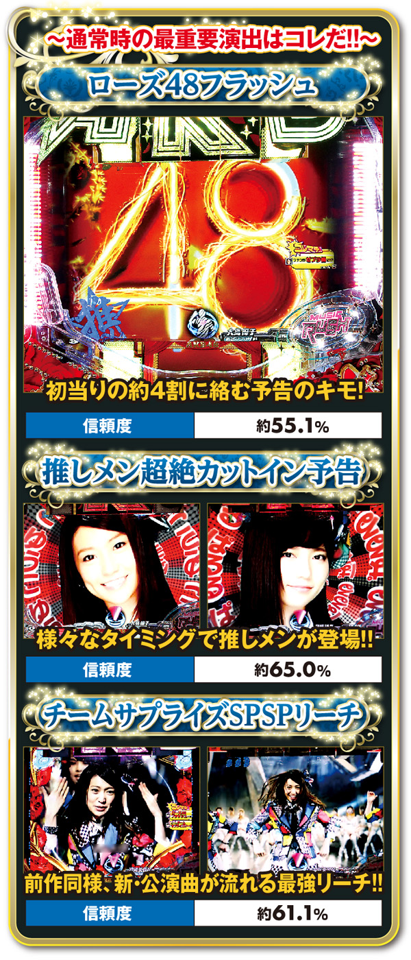 ショールームでの先行試打における、最重要演出を3つ掲載した。48フラッシュは前作までに比べると信頼度こそ下がったが、初当りの大半に絡む割合は過去最高だ。
