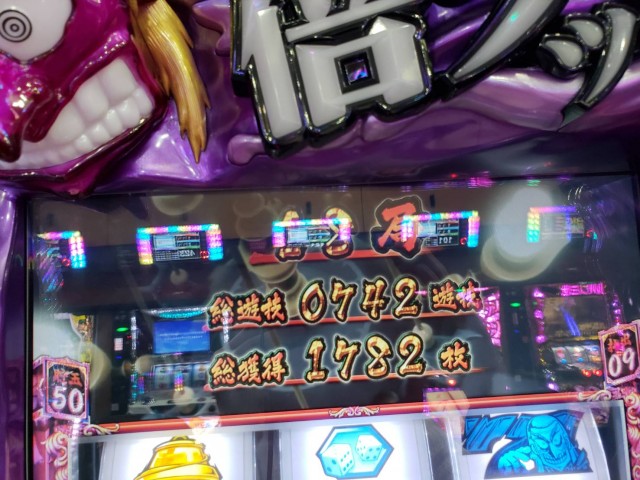 勝負としてなんとかなっているのは相変わらずパチンコを打ってるオモCのみでプラス5000発。オデ&MYME先生は投資こそ35本前後でストップしたものの、出玉はもう一息。ともに千枚程度のメダルを確保したところで店移動を決意。